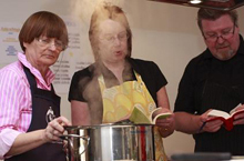 Toinen ruokakimara historian valossa Edelliskerrasta viisastuneina halusimme stressaantua vähemmän, emmekä enää kutsuneet vieraita, vaan João näytti, miten kukin kuusi historiallista ruokalajia valmistetaan. Me oppilaat katselimme silmät pyöreinä pötsien, korvien ja sorkkien muuttumista portugalilaisiksi herkuiksi. Totta kai leipää oli mukana paahdettuna ja keitoksissa. Jaoimme päivän kolmen ruokalajin valmistuseriin ja nautimme niistä – tietysti tuomiemme viinien kera. João kertoi ruokiin liittyviä tarinoita ruokapöydässä, ja niin olimme vatsat pulleina henkisesti ravittuja ja aloimme valmistaa seuraavia kolmea ruokalajia. Tyypillisesti näyttää siltä, että portugalilainen ottaa ensimmäiseksi oliiviöljyä, sipulisilppua ja valkosipulia ja heittää ne pannulle. Sen jälkeen hän ryhtyy vasta miettimään, mitähän tekisi. Näitä aineksia nimittäin löytyy lähes jokaisesta ruokalajista, joita valmistimme. Reseptit ja historia ovat niistäkin näillä sivuilla, joten kipinkapin lukemaan. Mielenkiintoista oli nähdä, kuinka aggressioitaan voi purkaa ruoanlaitossakin, kun keitettyä turskaa hakkaa oikein olan takaa pyyhkeen sisässä pöytää vasten. Touhu kesti ainakin kymmenen minuuttia – tuli ihan mieleen Nummisuutarin Eskon kosioreissu eväspussi olalla. Kun turskapussi avattiin, tuloksena oli hienoksi jauhautunut kala, josta ruvettiin tekemään kalapalleroisia varten taikinaa. Niitä ei suinkaan pyöritelty palloiksi kädessä tai pöydällä, vaan kahdella lusikalla kääntämällä toisiaan vasten syntyi hienoja pitkulaisia teoksia, jotka sitten uppopaistettiin. Nami nami… ”pasteis de bacalhau” Vesi kielellä huhti- ja toukokuista ruokahetkeä odottelemaan, niihin voi jo ilmoittautua. Teksti: Sisko Vuorenmaa, kuvat: Kari Koskelainen 24.3.2009 | |